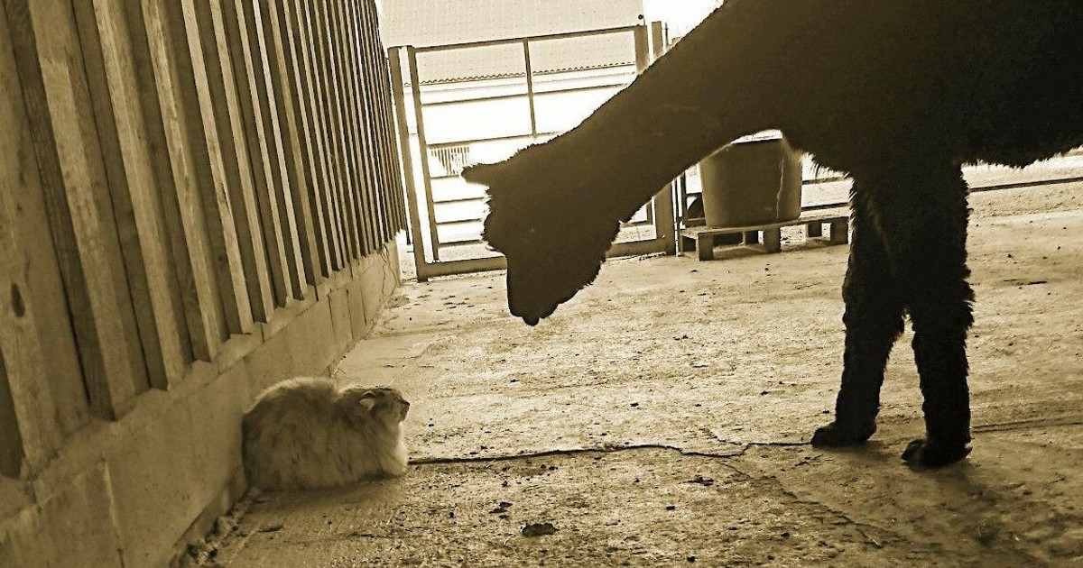 Här är det alpackan Zorro som blir tillrättavisad av gårdskatten Karamell.