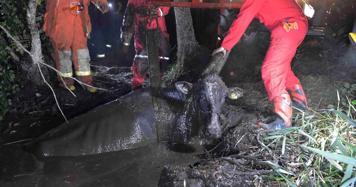 Dramatisk räddning när åskan skrämde ner ko i kärr