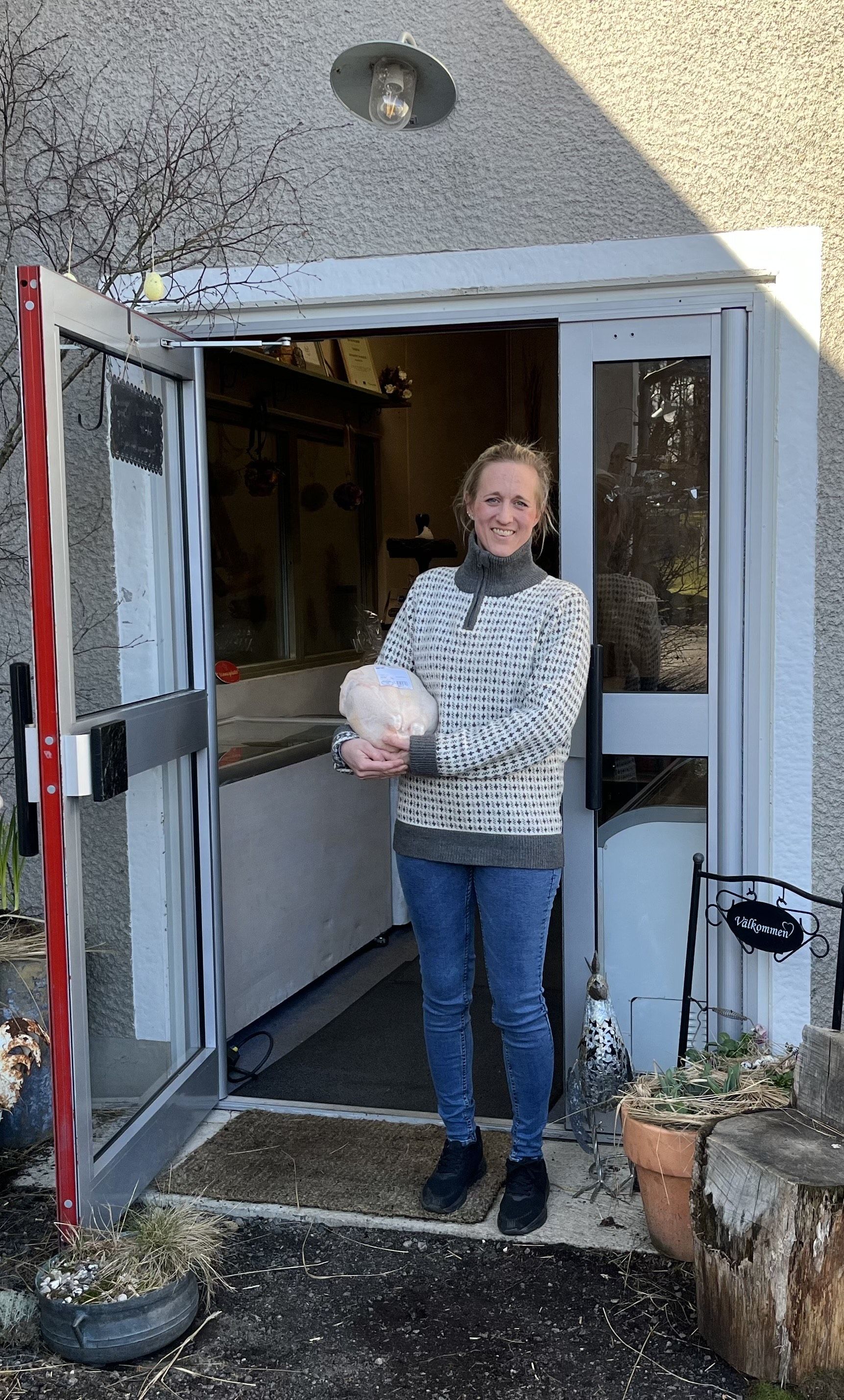 – Det är en släktgård som har tillhört Andrés familj där det inte hade bedrivits produktion på många år. Boningshus och ekonomibyggnader var väldigt förfallna så vi rev alltihop och byggde nytt. Ekonomibyggnaden är utformad som ett L med gårdsbutiken placerad i vinkeln så att man genom glasat fönster kan se in till kycklingarna. I ena änden av byggnaden ligger ett förvaringsrum för halm och sådant och i den andra ett häststall, förklarar Alexandra Cronqvist.