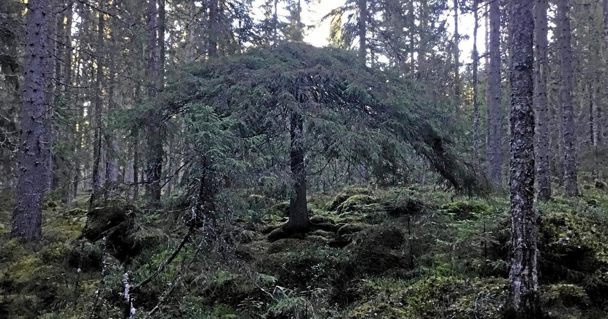 En gran som verkar vilja vara ett parasoll. Den växer i skogen nära Ekshärad.