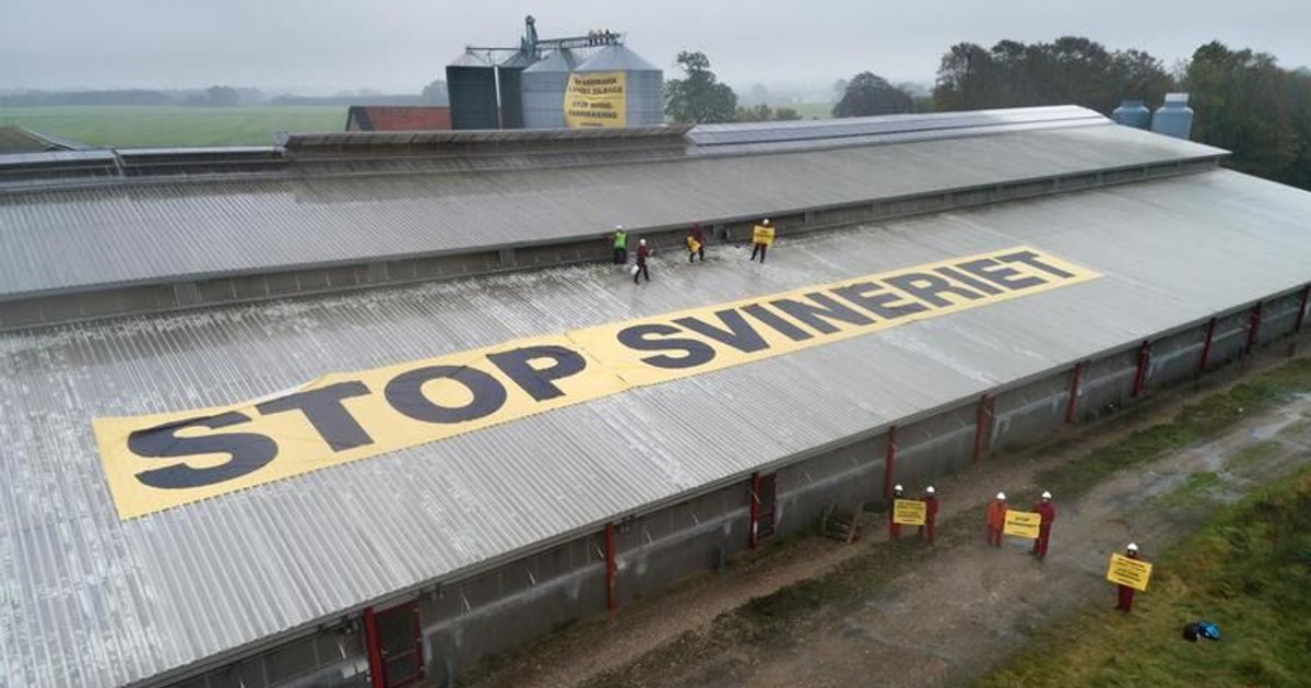 Det var på tisdagsmorgonen som 17 aktivister klättrade upp på taket till den stora grisgården väster om Köpenhamn och satte fast en 42 meter lång banderoll med texten "Stoppa svineriet".