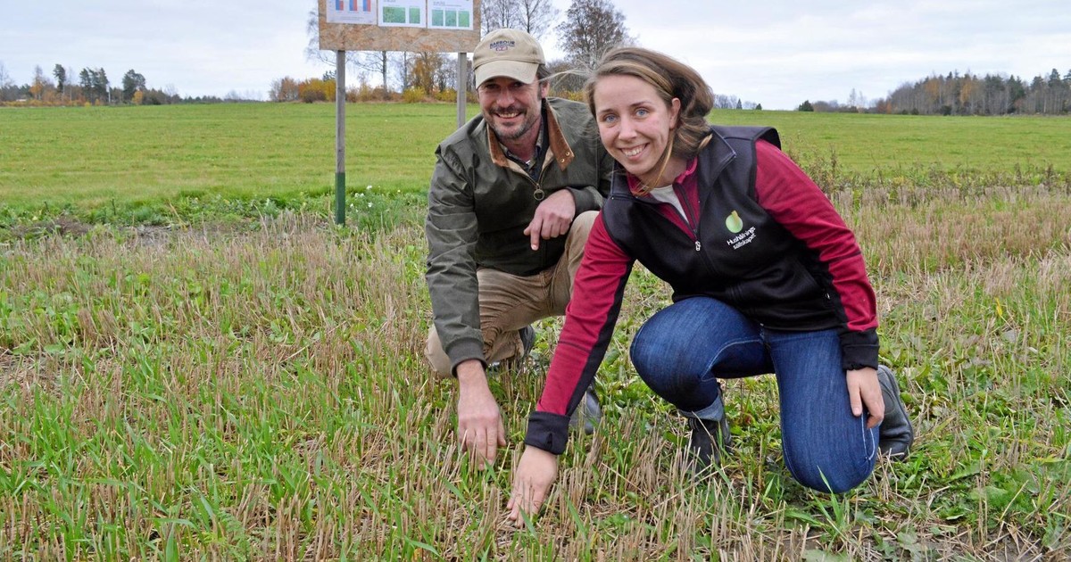 Alexia von Ehrenheim och Petter Ström på HS Konsult, i demoodlingarna med mellangrödor på Brunnby Gård. FOTO: ANNA ELLSTRÖM