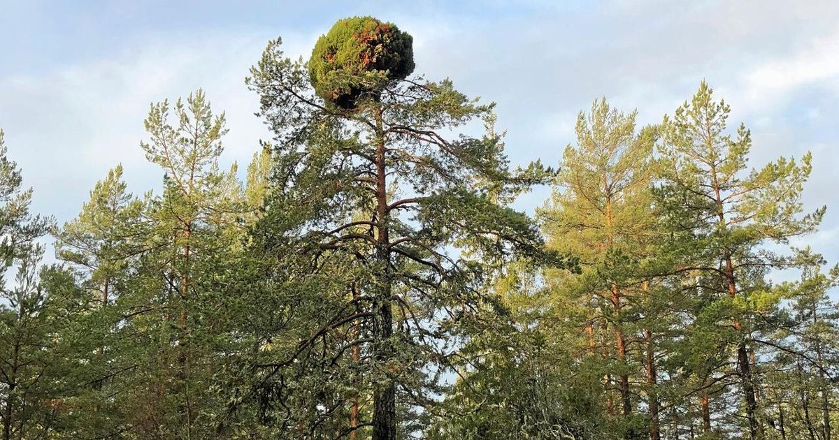 I Lofta, norr om Västervik hittade Tomas och Kerstin Andersson denna tall. De undrar vad som har hänt som orsakat dess märkliga utseende. Kanske finns det någon läsare som har förslag på vad som kan ha hänt?