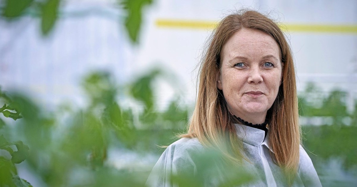 Alfred Pedersens platschef i Trelleborg Mindaugas Krasauskas, platschef på Alf Pedersen & sons tomatodling i Trelleberg, visar Jennie Nilsson ett av de stora växthusen. FOTO: STEFAN LINDBLOM/HELSINGBORGS-BILD
