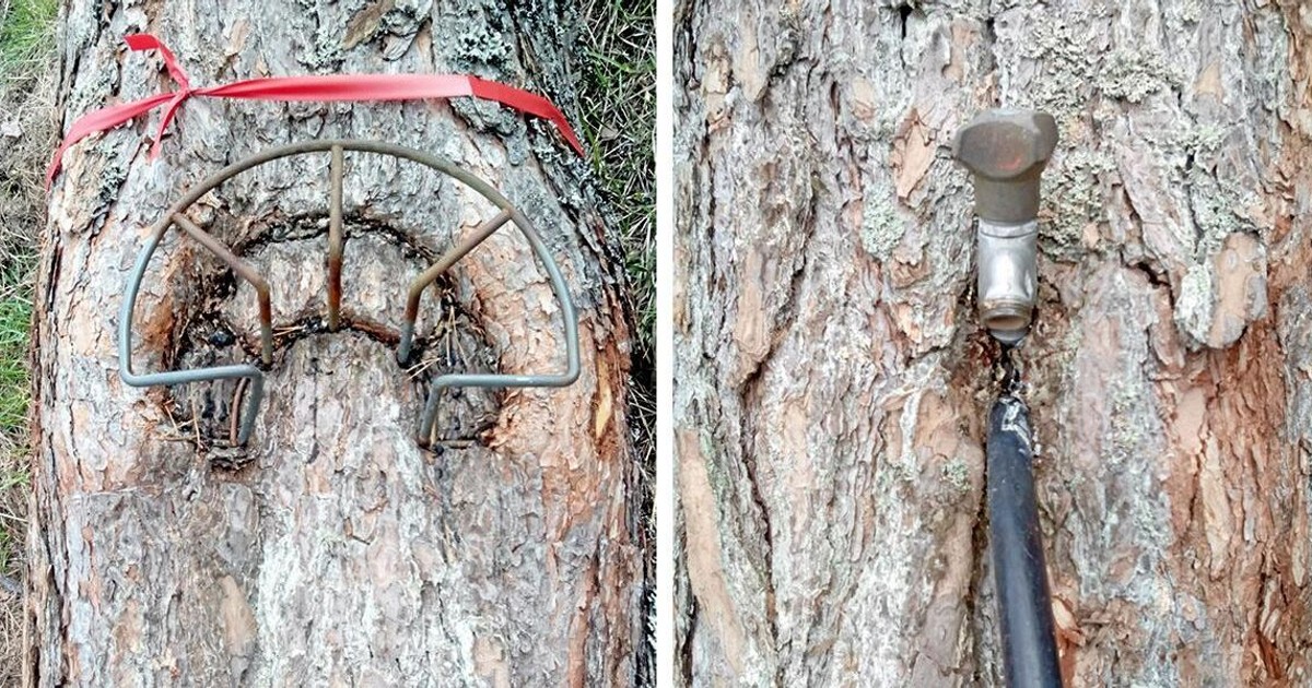 När Tomas Jonson skulle på en trädfällning hittade han inte bara träd utan även invuxna slanghållare och en kran. Frågan är när de monterades undrar hans sambo Caroline Thunman som skickade in bilderna till Land Skogsbruk.