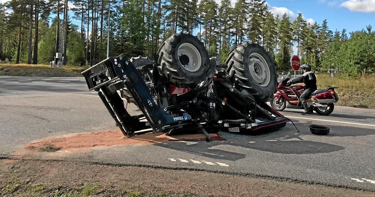 Men i svängen svepte kärrans bakände ut. Långtradaren hakade fast i traktorsläpet och gav hela ekipaget en sådan skjuts att traktorn slog runt och blev liggande upp och ned på vägen med ihoptryckt hytt.